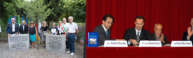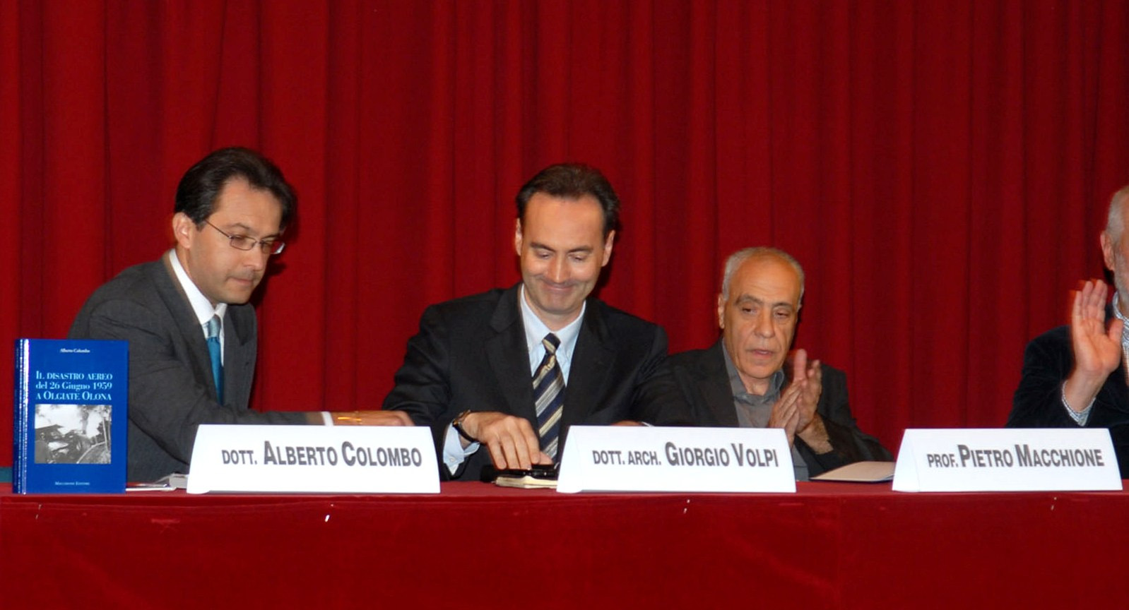 Il sindaco di Olgiate Olona e i promotori degli eventi commemorativi del disastro aereo del 26 giugno 1959 con commossa gratitudine ricordano due persone che hanno onorato le settanta vite immortali e recentemente ci hanno lasciato dopo breve malattia: Giuseppe Conte (1950-2025) di Cassano Magnago, padre di Andrea, una delle 118 vittime dell’incidente aereo di Milano-Linate, consigliere e tesoriere del Comitato 8 ottobre, fedele all’annuale commemorazione del 26 giugno (nella fotografia accanto al sindaco Montano alla cerimonia 2016); il varesino Pietro Macchione (1943-2026), editore dei volumi sul disastro aereo (nella fotografia alla presentazione dell’11 ottobre 2008 in municipio a Olgiate Olona a sinistra del sindaco Giorgio Volpi).